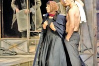 Московский театр «Ведогонь» представил свою постановку «На дне». Оригинальные декорации из стекла и ломаных геометрических фигур. Ничем не примечательные, подчеркнуто простые серые, черные, иногда белые наряды. Демонстрация персонажами не столько жестокости, сколько надрывной недоброты друг к другу.