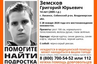 Поисковый отряд "Лиза Алерт" обращается за помощью в розыске Григория Земскова 2005 года рождения, жителя города Лакинск Владимирской области. С 28 января его местонахождение неизвестно. Школьник нуждается в медицинской помощи.