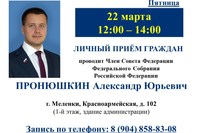 22 марта член Совета Федерации Федерального Собрания Российской Федерации Александр Пронюшкин проведет приём граждан в Меленках.