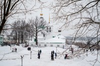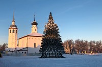 Новогодний подарок жителям и гостям Суздаля. На Торговой площади теперь сверкает не только традиционная новогодняя елка, но и купола храма. Вместо черного старого купола белокаменная церковь получила золотой. Средства выделил меценат.