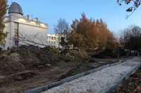 Около Дворца детского (юношеского) творчества на улице Мира завершается демонтаж тротуарных плит, устройство новых прогулочных аллей, уличного освещения и площадок для будущего детского городка. По контракту работы должны закончить в ближайшие три недели.