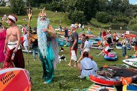 Рекордное количество участников собрал фестиваль на реке Каменка в прошлом году. Во Владимирской области более тысячи человек решили проплыть по узкой реке в городе-музее на сап-бордах, в костюмах любимых сказочных персонажей. Это была скорее "река" из участников, водной глади почти не было видно.