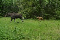 Прекрасную лосиную семью зафиксировали фотоловушки Дирекции особо охраняемых природных территорий Владимирской области. На лесную полянку выбежала мама с маленьким рыжим лосенком.