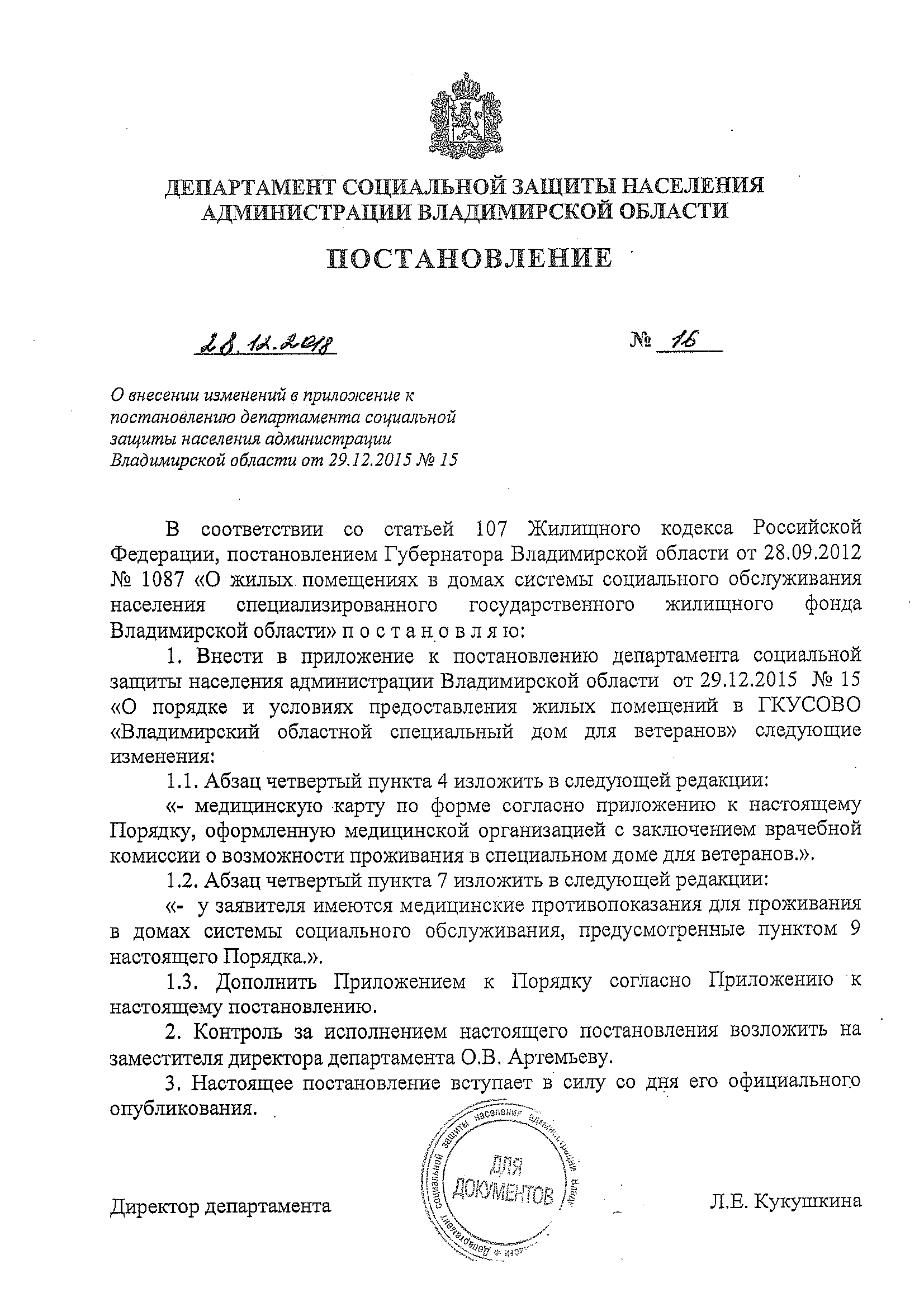 О внесении изменений в приложение к постановлению департамента социальной защиты населения администрации Владимирской области от 29.12.2015 №15