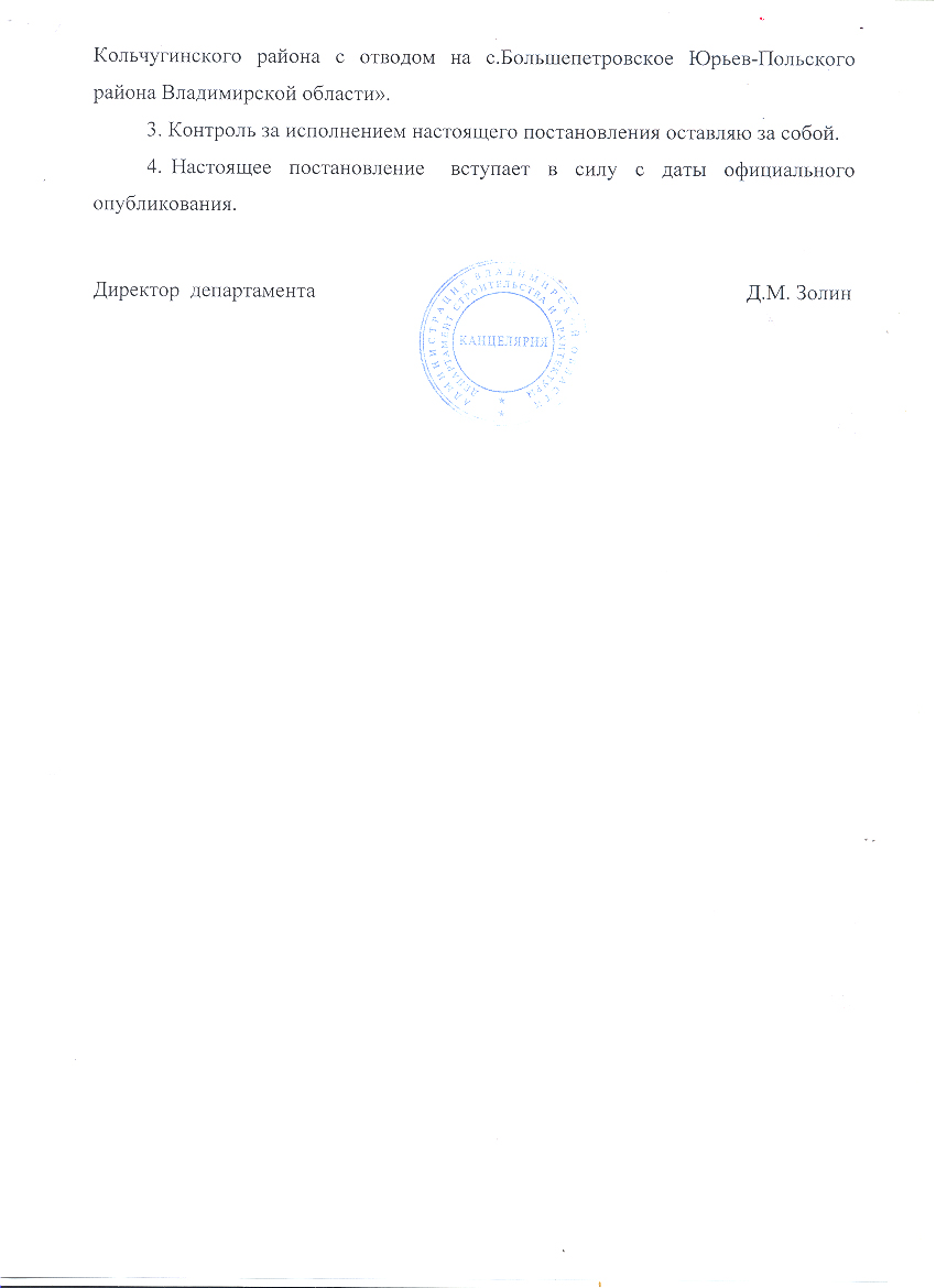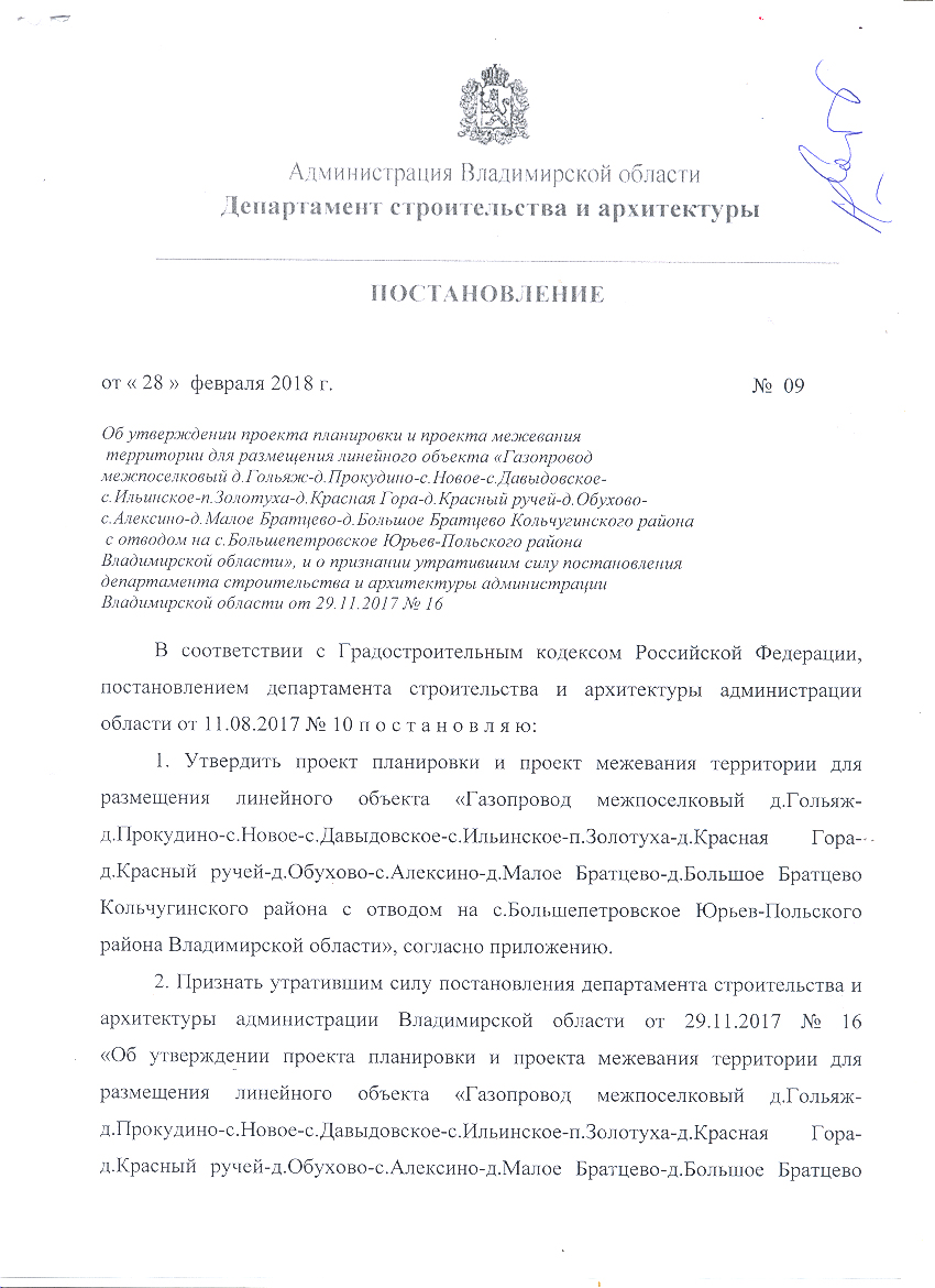 Об утверждении проекта планировки и проекта межевания территории для размещения линейного объекта «Газопровод межпоселковый д.Голъяж-д. Прокудино-с. Новое-с. Давыдовское- c. Ильинское-п.Золотуха-д. Красная Гора-д. Красный ручей-д. Обухово- с.Алексиио-д. Малое Братцево-д. Большое Братцево Кольчугмнского района с отводом на с. Большепетровское Юръев-Польского района Владимирской области», и о признании утратившим силу постановления департамента строительства и архитектуры администрации Владимирской области от 29.11.2017 № 16