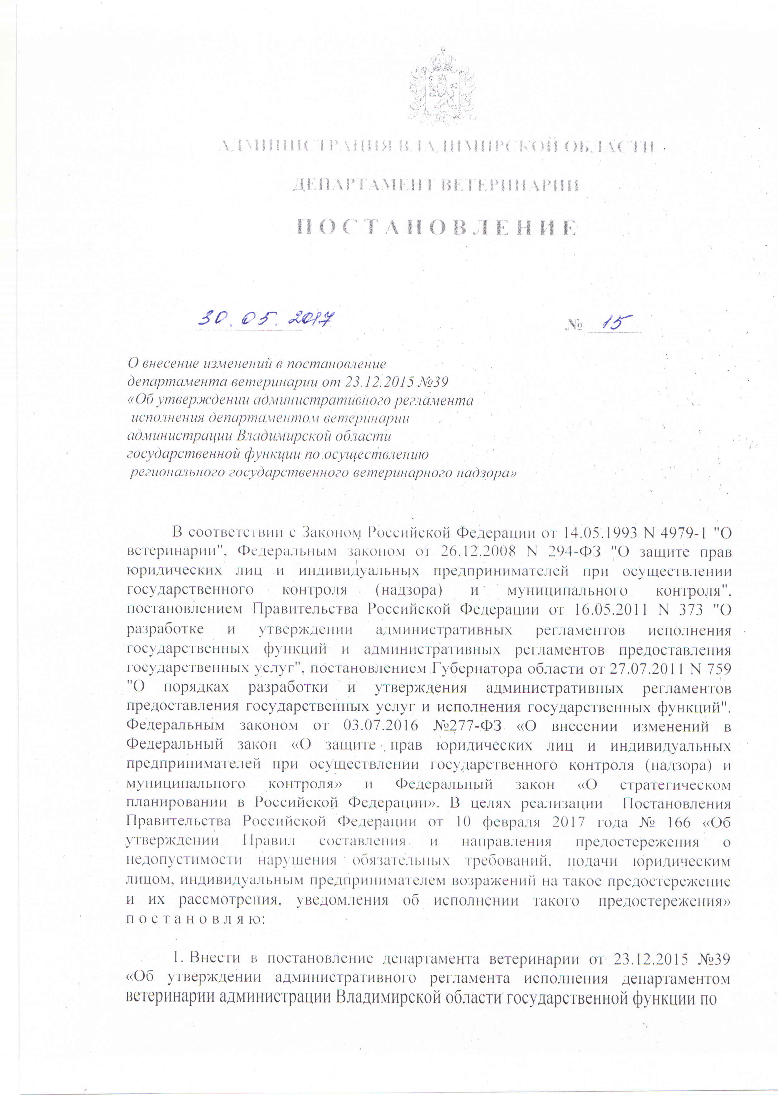О внесение изменений в постановление департамента ветеринарии от 23.12.2015 №39 «Об утверждении административного регламента исполнения департаментом ветеринарии администрации Владимирской области государственной функции по осуществлению регионального государственного ветеринарного надзора»