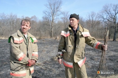 Огонь уже пробирался к деревьям. На кромке пламени, поднимавшегося местами до полуметра, мы увидели за работой пожарных базирующейся в Коммунаре 59-й части 1-го отряда Федеральной противопожарной службы Александра Мартынова и Бориса Нестерова (как выяснилось при дальнейшем знакомстве). Большими пучками ветвей они сбивали пламя. За несколько минут на наших глазах его потушили. По словам пожарных, их вызвали по телефону бдительные отдыхавшие. Машину с водителем и запасом воды они оставили на подъезде к вязкой низине, поняв, что справятся подручными средствами.