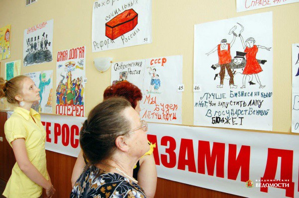 Работы были выставлены в актовом зале здания на Луначарского, 3. На первый раз было представлено около двух десятков работ ‑ совершенно разного качества и содержания. Объединяла их общая направленность политических взглядов юных плакатистов. Было очевидно влияние «Надежды России» и КПРФ. Будущее России в представлении детей может показаться весьма мрачным: плакаты будоражили зрителей опасностями засилья платного образования и здравоохранения, закрытия школ и нехватки детских садов. Буржуи в цилиндрах, радостно приплясывающие на «вершине мира», символизировали разбогатевших за счет народного добра бывших деятелей КПСС, которые изменили прежним идеалам. А над ними ироничная надпись: «Вышли мы все из народа, дети семьи трудовой». Близок по теме и плакат «Лучше бизнеса не было и нет, чем запустить руку в государственный бюджет», где буржуй вылезает из-за фигур рабочего и колхозницы. Юные художники не скрыли, что замысел плакатов возникал под влиянием разговоров с родителями, бабушками и дедушками. Но не только.- Мы и сами видим, что происходит в стране, - говорят дети,