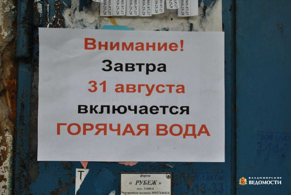 Горячая вода в дома жителей Александрова и Александровского района перестала поступать в мае. Причина ‑ накопленные александровцами гигантские долги по оплате «коммуналки». Поставщик газа в лице ООО «Владимиррегионгаз» повел жесткую политику в отношении «проштрафившегося», что привело к отключению всех котельных. И «индекс качества жизни» горожан стремительно рухнул вниз. И не только отдельных горожан. Например, в центральной районной больнице были серьезные проблемы с обработкой хирургических инструментов, свои «неудобства» испытывал и персонал родильного отделения. По причине внезапного отключения городского банно-прачечного комбината, который, кстати, исправно оплачивал все коммунальные услуги, было испорчено полтонны белья, направленного туда из больницы.