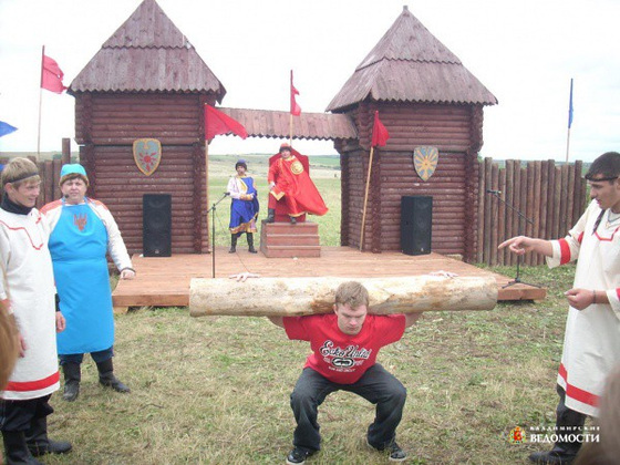 А когда все гости по ярмарке нагулялись, объявил светлый князь, что для защиты Ростово-Суздальского княжества собирает он дружину крепкую, и предложил провести состязание, чтобы выявить самых достойных. Но без помощи туристов ремесленникам не справиться. Так что гости фестиваля вместе с набойщиками и кожевенниками и бочки катали, и бревна поднимали, и канат перетягивали, и телеги сеном нагружали, и стенка на стенку сходились. А соревнования, как известно, захватывают. Вот Роман из Ярославля присел с бревном на плечах 45 раз, и тут же из группы, что приехала из Нижнего Новгорода, вышел Артем и, поддерживаемый земляками, установил своеобразный рекорд этого дня ‑ 60 раз. Всем было весело, каждый мог испробовать свои силы в том или ином конкурсе, всех благодарил князь за силу да удаль. А самых сильных да храбрых записал он в свою дружину, наградив памятными сувенирами.