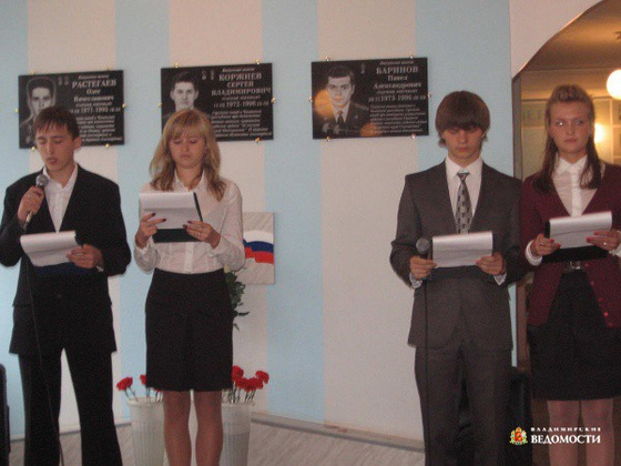 Олег Растегаев, Сергей Коржнев и Павел Баринов учились в 16-й школе. Они были среди лучших, строили большие планы на будущее, не предполагая, что жизнь окажется такой короткой. Годы их рождения подряд ‑ 1971, 1972 и 1973-й, годы смерти тоже один за другим ‑ 1995, 1996, 1997-й.Мемориал славы в школе появился по инициативе учителей Елены Мальцевой и Ольги Аракелян, проделавших огромную организационную работу. Они хорошо помнят погибших ребят. Елена Владимировна была классным руководителем у Олега Растегаева, Ольга Юрьевна ‑ одноклассницей и другом Сергея Коржнева. Памятные мемориальные доски с портретами этих двух ребят появились раньше, а в дождливый день 18 сентября мемориал пополнился еще одной, посвященной старшему лейтенанту Павлу Баринову. Он погиб, исполняя воинский долг в Чечне, 20 сентября 1997 года.
