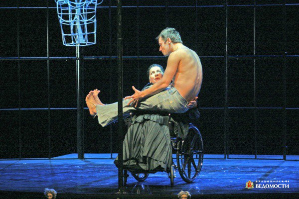 Тут играют свою роль абсолютно все предметы интерьера: стулья, искусственные розы с шипами, высокая металлическая лестница и решетка, инвалидное кресло и даже металлические крылья ангела. Не хватало в декорациях, пожалуй, лишь одного - железного занавеса, который все же неслышно, но упал в самом конце действа.