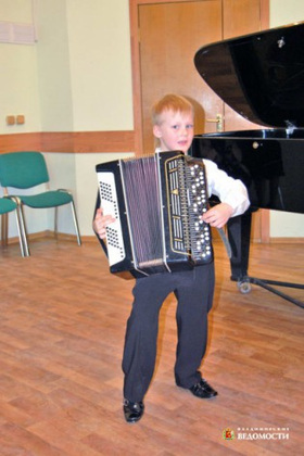 Большие надежды подает самый юный участник концерта - шестилетний баянист Артем Мокин, воспитанник отделения раннего эстетического развития. Его преподаватель Валентина Николаевна Литвинова рассказала, что он учится всего первый год, а уже радует и удивляет своими успехами. Артемка больше всего на свете любит носить по дому, довольно тяжелый инструмент и играть. Заметно, что на сцене маленький и шустрый баянист чувствует себя непринужденно, непременно сопровождая свое выступление эмоциями и обаятельной улыбкой.