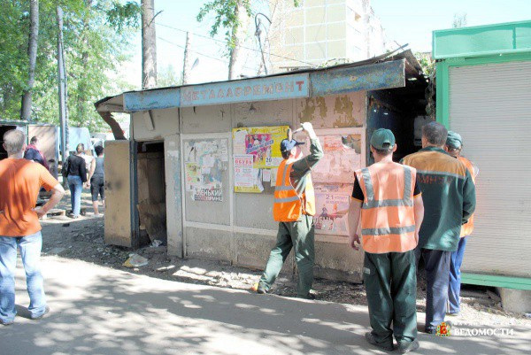 На одной из оперативных летучек в районной администрации Сергей Иванович дал поручение и.о. главы Александрова Николаю Матвееву заняться наведением порядка в сфере мелкорозничной торговли на территории города. Первые показательные шаги были сделаны в начале июня в микрорайоне Черемушки на так называемом «пятачке», где концентрация палаток, пожалуй, выше, чем где бы то ни было в Александрове. В первую очередь опале подверглись киоски, представляющие собой нефункционирующие объекты, и не имеющие разрешительных документов торговые нестационарные точки. Рабочие долго примерялись к давно неработающей палатке с надписью «Металлоремонт», опасаясь, что при ее перемещении с помощью подъемного крана она просто-напросто может развалиться. И не без основания. Из вздернутого краном обветшалого домика, который уже значительное время использовался как помойный контейнер, вытрусилась парочка «КАМАЗов» мусора. Мусор отправили на городской полигон, а палатку ‑ для временного хранения на территорию бывшего АТП. Но поскольку, скорее всего, владелец этого памятника купеческой архитектуры ХХ века не найдется, то она последует за своим содержимым на утилизацию. Еще один расположившийся по соседству тонар, хозяин которого не имел нужных бумаг, был увезен самим владельцем в неизвестном направлении.Также с территории города была депортирована деревянная бытовка, которая долгое время красовалась на стыке улиц Перфильева и Октябрьской. А вот хозяина этого сооружения, снабженного номером телефона и служившего, видимо, своеобразной рекламой для умельца-изготовителя подобных архитектурных форм, найти не удалось.