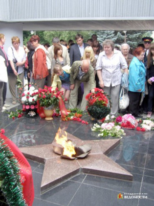 …В минуту молчания у Вечного огня и стар и млад скорбели по всем погибшим, замученным в фашистской неволе, погибшим на поле боя и умершим от ран в госпиталях.