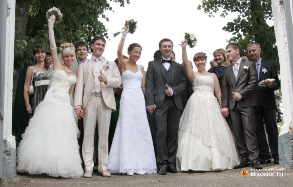 После утвердительного ответа, как и полагается, каждую пару молодых объявили мужем и женой, и они впервые надели другу другу обручальные кольца, призванные оберегать семейное счастье. Гости сопроводили процесс рождения новых семей бурными овациями и прокричали «Горько!». Первым молодоженов поздравил, вручив им свидетельства о регистрации брака и подарки, глава администрации г. Владимира Андрей Шохин.