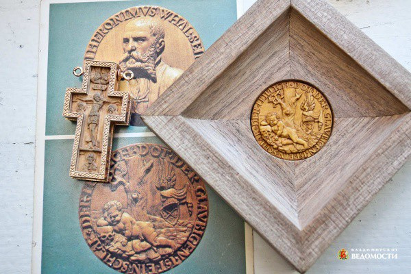 В руках у Олега Кучерова - деревянная копия медали XVI века неизвестного немецкого мастера, выполненная из самшита. Ее он вырезал год назад. Работа из разряда ювелирных, четко очерчены и выверены все грани. В нее вложено очень много сил. А мечтал выполнить медальон Олег еще со школьной скамьи: