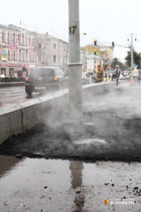 Утро пятницы, 9 сентября. Центр города Владимира - путепровод напротив Дома дружбы. Дождь. Привычная картина: рабочие в клубах пара укладывают новый асфальт прямо в лужи.