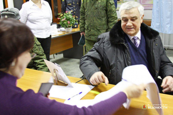 Уже в этот момент на участке было довольно многолюдно. Прежде всего за счет избирателей в военном камуфляже. Первая группа солдат во главе с офицерами вошла голосовать почти одновременно с губернатором.