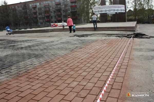 Вероятно, чтобы подчеркнуть значимость майских праздников для города воинской славы, местные власти распорядились провести благоустройство. Далеко не новый и местами растрескавшийся асфальт площади нарезали на квадратики, имитирующие плиточное покрытие. Затем эту асфальтную нарезку покрасили в коричневый цвет.В первом приближении эта красотища напоминала брусчатку. Работы, по сообщению официального сайта администрации Коврова, назывались термопрофилированием. Выполняло их некое ООО «Шельф».
