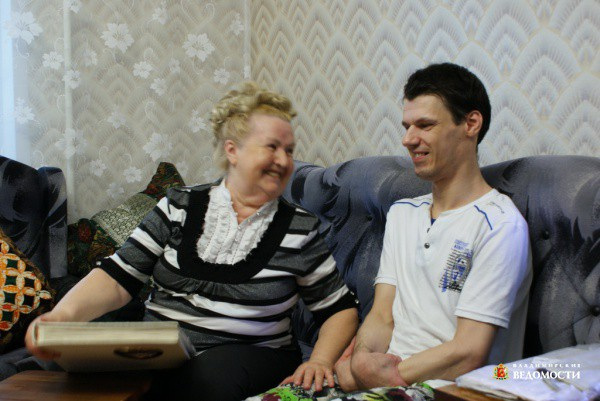 Они живут вдвоем с мамой и ради друг друга. Она шьет удивительной красоты подушки, вышивает бисером иконы, разбила сад под окнами девятиэтажки, чтобы сделать более приветливым мир, в котором живет сын. Он в меру своих сил и даже сверх того пытается облегчить матери домашние хлопоты. Самостоятельно убирает квартиру: пылесосит, моет полы, вытирает пыль, хотя передвигаться может только на коленях, которые стер до мозолей. Они утверждают, что ни разу не ссорились.