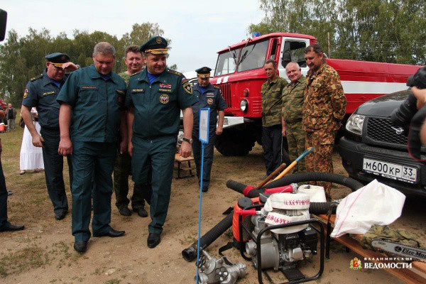В нашем регионе смотр сил и средств пожаротушения Владимир Пучков провел на стадионе в городе Петушки, а доклады по теме выслушал в спортивном зале при том же стадионе. Министр лично обошел импровизированную экспозицию подразделений Петушинского звена территориальной подсистемы РСЧС. Отдельного внимания на этой мини-экскурсии от высокого гостя дождался особый сотрудник - трехлетний черный лабрадор Баркас (для друзей - просто Бася), натренированный на поиск людей в лесах и под завалами. Владимир Андреевич с удовольствием погладил симпатичного пса. Баркас «лаской от министра» был явно польщен...На совещании и.о. губернатора Владимирской области, председатель региональной КЧС Алексей Конышев доложил главе министерства о ходе работ по обводнению торфяных полей на территории района и о ситуации в пожароопасный период.