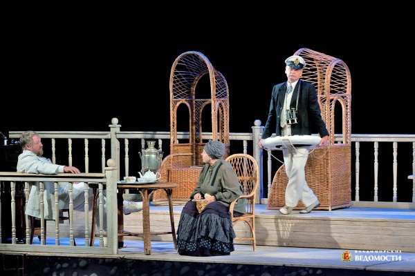 …То ли помещичья усадьба, то ли палуба корабля... Не сразу и разберешь - декорации и костюмы героев ненавязчиво указывают на «морскую принадлежность». На Сонечке - матроска, у Елены Андреевны - полосатая юбка «в пол», а Иван Петрович предстает перед зрителем в капитанской фуражке с «крабом». Ну и чтобы уж совсем не было сомнений, что действие происходит на корабле, милейший дядечка перед тем, как пуститься в пляс, прихватывает для пущей элегантности спасательный круг с лаконичной надписью - «дядя Ваня». Точно! Палуба это, а не какая не веранда, не аллея рядом с господским домом, на что вроде бы ясно Антон Палыч указывал.- Корабль, значит, - размышляет уловивший режиссерский намек зритель. - А женщина на корабле - быть беде…