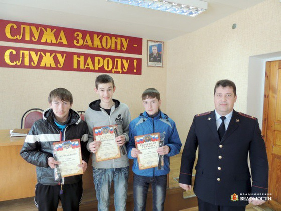 Ребятам, задержавшим преступника, на совещании в ОМВД России по Камешковскому району в присутствии личного состава были сказаны слова благодарности за активную гражданскую позицию, оказание помощи в раскрытии преступления. Начальник ОМВД подполковник полиции Алексей Частухин вручил подросткам почетные грамоты и ценные подарки.