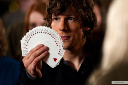 В «Иллюзии обмана» Айзенберг играет лидера очень талантливой компании фокусников, навострившихся прямо во время своих шоу на расстоянии грабить банки и осыпать якобы украденными деньгами зрителей. Ребята курсируют по крупным городам США, за ними следуют упомянутый разоблачитель и агенты ФБР и Интерпола. Финальное шоу этого гоп-тура проходит в Нью-Йорке. И, как ни странно, действует великолепная четверка прежде всего из любви к искусству. Причем я до этого фильма назвать фокусничество искусством не могла. Теперь могу, хотя и не с легкой душой.