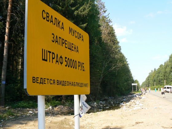 Дорога Киржач - Александров. Прямо под объявлением «Свалка мусора запрещена. Штраф 50 000 рублей» горы отходов: пакеты, упаковка от крупной бытовой техники, канистры из-под химикатов, бутылки, покрышки, отслужившая свое обувь. В придорожных канавах зеленоватая зловонная жижа. Из кустов прямо на нас выходят собаки в надежде поживиться «свеженькими» объедками. Но мы вынуждены их разочаровать: приехали не с мусором, а с фото- и видеокамерами. Поняв это, животные удаляются в чащу.