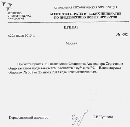 Вот мы и узнали, является Александр Филиппов региональным общественным представителем Агентства стратегических инициатив (АСИ), созданного в августе 2011 года по поручению Путина, или нет. Не является.