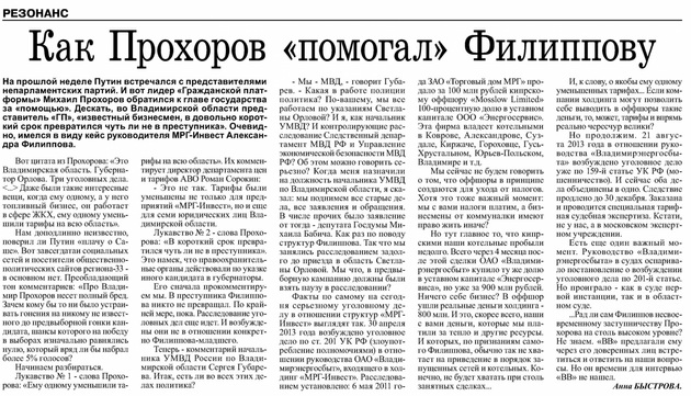 В среду, 27 ноября, «ВВ» напечатали заметку «Как Прохоров «помогал» Филиппову». Заметка была нашей рефлексией по отношению к словам лидера «Гражданской платформы» на встрече президента Путина с непарламентскими партиями. Прохоров попытался обелить светлое имя главы МРГ-Инвест Александра Филиппова, намекая на то, что уголовные дела в отношении контролируемых им фирм (в том числе и «Владимирэнергосбыта») - политического происхождения. Дескать, пошел человек кандидатом в губернаторы ‑ а другой кандидат в отместку натравил на него всю правоохранительную рать региона-33, а заодно и федералов. Полностью статью можно прочесть здесь: http://www.vedom.ru/news/2013/11/26/11820-kak-prohorov.