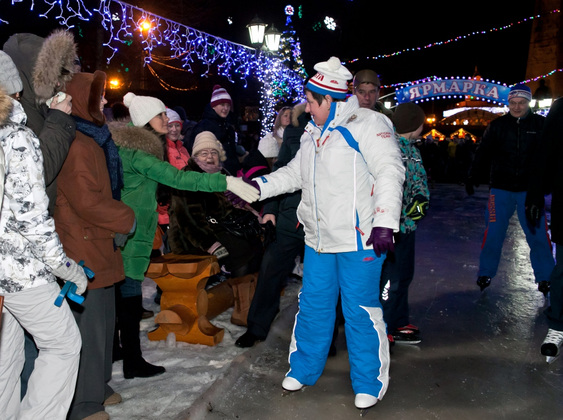 - Наконец-то поставила чиновников на коньки! ‑ радовалась Светлана Юрьевна, одетая в белый спортивный костюм и шапочку с российской символикой. Она уверенно проехала кружок по катку. Отметила, что лед пока «не очень», но впечатления все равно хорошие, праздничные.