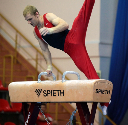 Зато отлично выступил один из самых опытных гимнастов нашей школы Антон Неудакин. Не так давно он получил травму, и тренеры даже поговаривали, что Антон пропустит эти старты. Но помочь команде надо, и в итоге - золото в опорном прыжке.