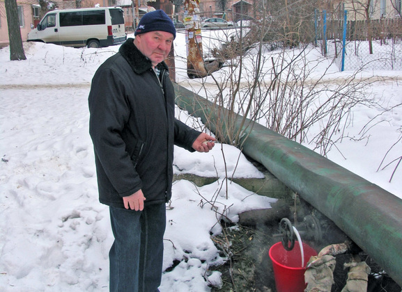 - Как с осени пробило, так и течет, - рассказывает старший по дому № 5 Александр Жуков. - Нам говорят, что зимой ремонтировать нельзя. А летом отопление отключают, и ничего и не течет. Но как отопительный сезон начинается, так снова все пробивает. Я решил подсчитать, сколько воды на этом теряется. Взял ведро и секундомер, замерил. За минуту натекло 3,3 литра. То есть за сутки через эту трубу вытекает более 4,3 тонны. А за весь сезон ‑ 561 тонна, 9 железнодорожных цистерн по 60 тонн! Сколько ж надо воды и энергии на постоянную подпитку? А сколько тепла уходит на улицу?