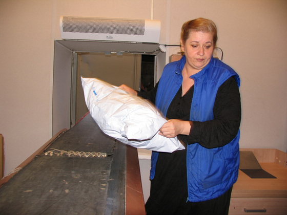 Одновременно сортируется входящая корреспонденция. Это тоже ручная (не в смысле, что уникальная, а в смысле, что тяжелая) работа. Машина с почтой приходит в отделение к началу рабочего дня, где-то в 8.30. Водитель выгружает мешки и коробки с письмами и посылками через приемное оконце на транспортер. По другую сторону окна груз принимает сортировщица Елена Смирнова. Она должна разгрузить транспортер, разобрать и рассортировать почту.