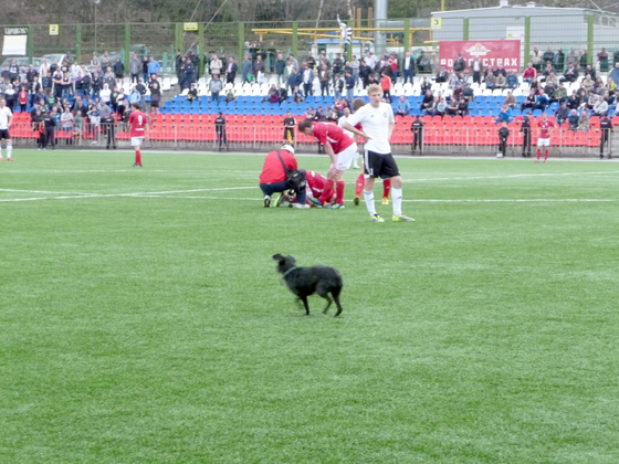 Интересно, что появление животных на поле связано почему-то именно со спартаковскими клубами. Не далее как прошлой осенью во время матча ветеранов московского «Спартака» и владимирского «Торпедо» на поле был выпущен петух, который забавно бегал среди игроков. Но тогда это была часть шоу.