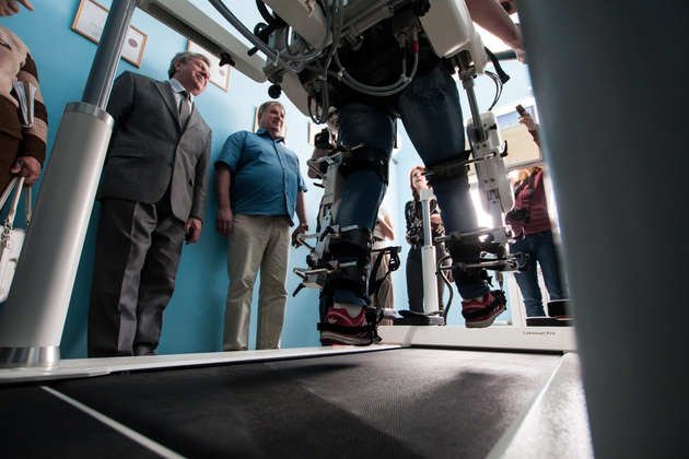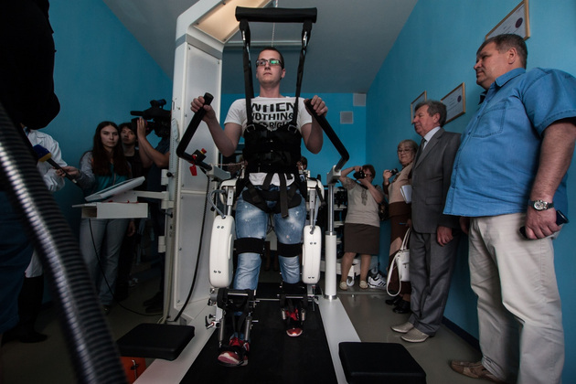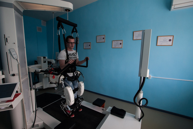 Аппарат представляет собой беговую дорожку, над которой в специальной конструкции подвешивается больной. Машина двигает его руками и ногами, помогая телу «вспомнить» ощущения при ходьбе. Это в свою очередь запускает нужные процессы в нервной системе. Перед установкой - большой монитор, на котором моделируются разные ситуации. Например, можно учить пациента обходить препятствия ‑ у робота много режимов работы. В общем, это чудо инженерной мысли, которое раньше я видела только на выставках робототехники и в американских фильмах.