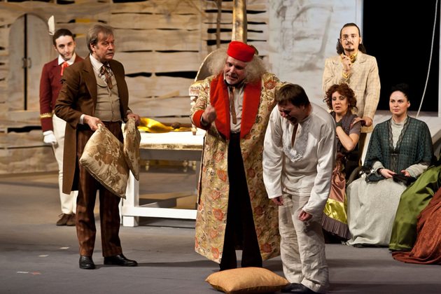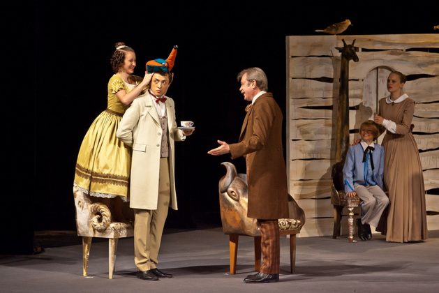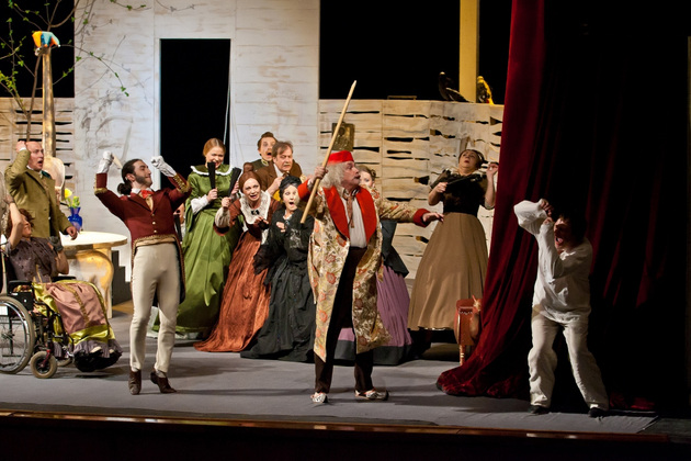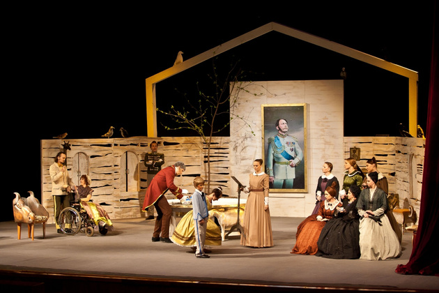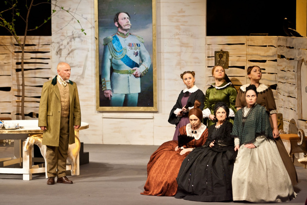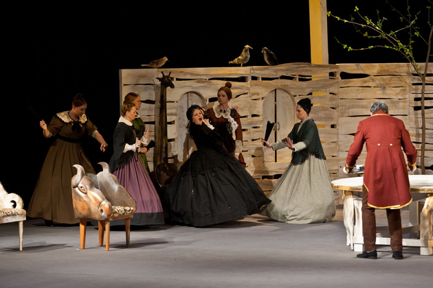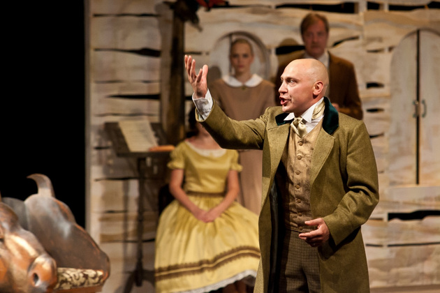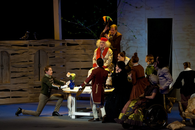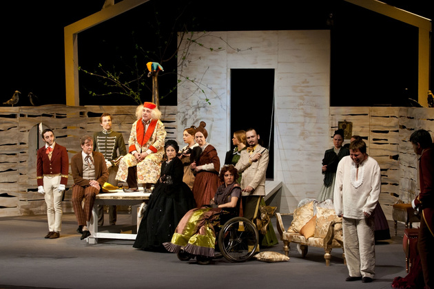 И вот мы видим декорации классической чистенькой усадьбы, явно не случайно подобранные стол, кресла и диванчики с декором в виде бараньих голов. Целый женский «курятник» в разноцветных пышных юбках, суетливый, размахивающий веерами и забавно повизгивающий. А в центре ‑ три мужских типажа, совсем не удивительных для русской провинции. Юноша, приехавший к родне то ли помочь, то ли предъявить права. Мечущийся от решимости к боязливости хозяин дома. И - обнаглевший донельзя нахлебник-гость Фома Фомич, который ходит по любезно кидаемым ему под ноги подушкам и изводит все честное собрание.
