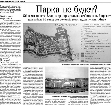 Думаю, если проекту дадут ход, из всего обещанного будет реализована, скорее, только общественно-деловая зона. А про сам парк правильно заметил директор «Владимиргражданпроекта» Николай Волков: «Парка не будет!»
