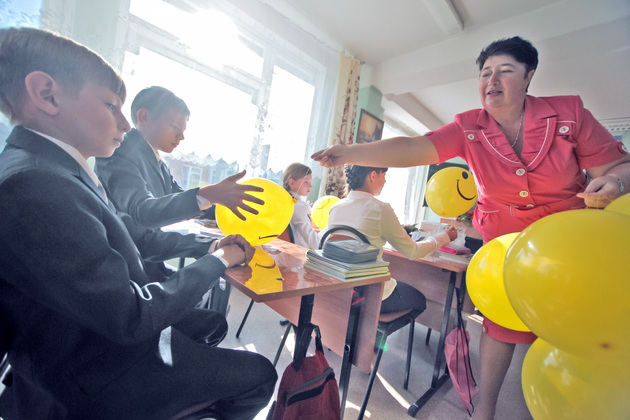 - Пусть нам всем станет еще радостнее и еще светлее станет наш замечательный класс, - говорит учительница, вручая шарики своим подопечным. ‑ А теперь - фотография на память.