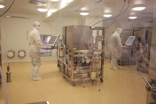 Площадь цеха 1480 «квадратов». Из них 1070 ‑ чистые категорированные помещения (то есть такие, куда входить надо практически в «костюмах космонавта»). Пока, по словам начальника цеха Александра Шитого, здесь разрабатываются продукты для клинических исследований. Когда хотя бы один из препаратов успешно пройдет испытания, можно будет использовать производственные мощности - чистенькие, с герметичными дверями, шлюзовыми камерами, изобилием внутри спецхолодильников, хроматографов, биореакторов и прочих агрегатов. Прежде чем запустить нас посмотреть на это производство, нам выдали спецодежду (халаты, шапочки, крепкие и плотные, а не как в наших больницах, бахилы) и попросили обработать руки дезсредством. Шитый рассказал нам, как цех делится на зоны чистоты и что на полной мощности он сможет производить 6-7 препаратов (до четырех тонн культуральной жидкости за смену).