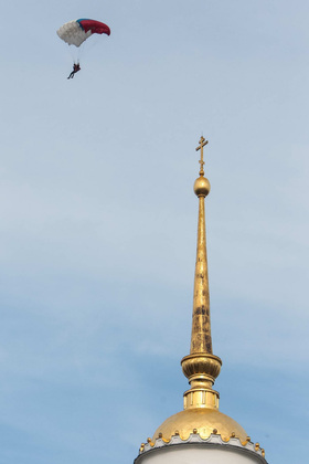 Раз за разом они поднимались ввысь на борту вертолета, с которого и совершали свои прыжки на «пятачок» зеленой площадки возле Успенского собора - на радость многочисленным гулявшим на празднике горожанам. Им надо было набрать большее количество очков за три зачетных прыжка.