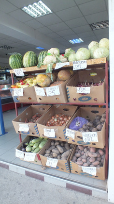На удивление мало собственных овощей и фруктов. Местные говорят, что это случилось из-за весенних перебоев с водой, когда бывшая крымская метрополия Украина перерезала подачу воды через канал. На рынках нередки были пустые прилавки - ни овощей, ни зелени. Правда, в изобилии местный виноград по 40-50 рублей за килограмм, невероятно вкусный. А еще инжир по 60 рублей за кило - на сентябрь приходится пик сбора урожая.