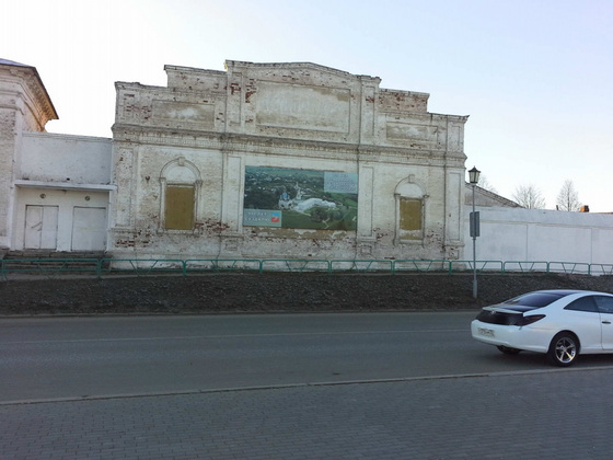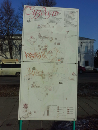 На улице Ленина ‑ схема Суздаля, выцветшая и расписанная вандалами. Прямо напротив администрации, на территории Ризоположенского монастыря, старое кирпичное здание с облетевшей штукатуркой и едва читающейся надписью «кинотеатр». Центральное его окно завешено красочным баннером: «990 лет Суздалю и 800 лет Епархии». А боковые окна просто забиты фанерой.