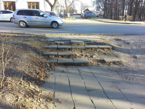Но вот мы делаем шаг в сторону Торговой площади. И тут же рискуем свернуть себе шею на рассыпавшейся лестнице. Там всего-то три ступеньки. Казалось бы, что стоит городу их подлатать? Но руки так и не дошли.