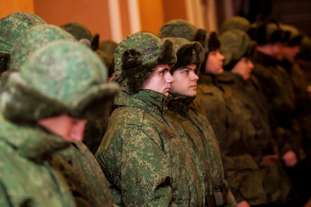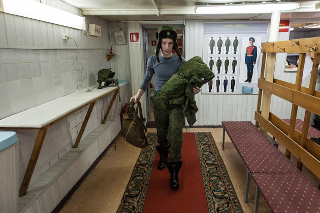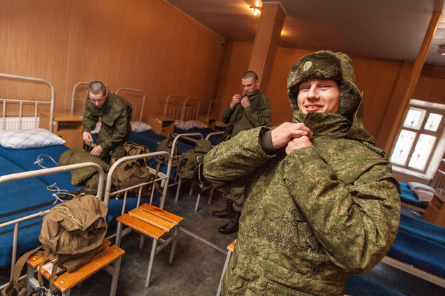Новобранцам определяют размер одежды, обуви, головного убора и выдают необходимый комплект: от нижнего термо-белья до рукавиц. Одеться по армейской моде мальчишкам помогают сотрудницы сборного пункта. Женщины (новобранцы им в сыновья годятся) внимательно подбирают формы каждому.