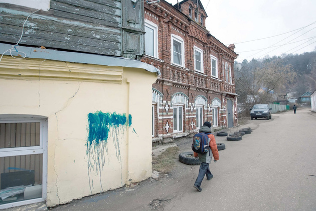 Первым делом он бежит, конечно, к реке. Там, на берегу Клязьмы, стоят два дивных каменных особняка, каких на всю страну осталось меньше двух десятков. И семь из них сохранились именно в Гороховце. Так вот, между двумя столь редкими памятниками гражданской архитектуры XVII века вдруг возникает нечто новодельное из силикатного кирпича с арочными окнами.