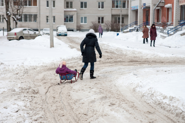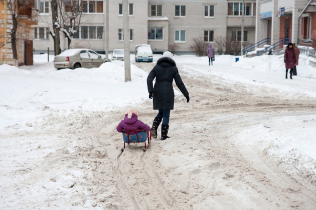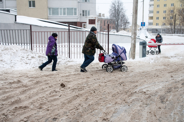 «ВВ» много лет поднимают этот вопрос. С колясками к крыльцу поликлиники зимой просто не протолкаться. Родители с детьми стараются ходить там, где снег расчищен. А расчищен он вокруг новостроек, въезды в которые обнесены аккуратными шлагбаумами. И вот на этих территориях все в идеальном состоянии. Почти Швейцария. По эту сторону шлагбаумов вновь начинается снежная каша.
