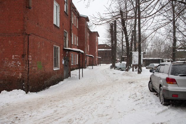 Следующий адрес - улица 1-я Пионерская. Заворачиваем в первый же двор, застроенный «хрущевками». Снежной каши тут нет, снег вполне аккуратно убран. Однако ходить по дорожке все равно не стоит ‑ она натуральный каток. Да, судя по всему, по ней никто и не ходит: между подъездами у стен домов (там, где ради эстетики летом обычно разбивают цветники) протоптаны основательные тропинки...